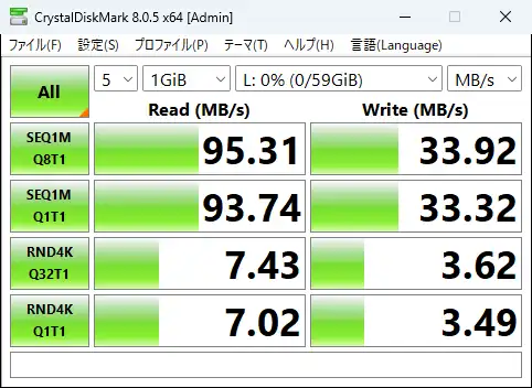 CrystalDiskMarkでの性能測定と、H2testwで容量偽装が無いかの確認を行いました。いずれもBUFFALO製のSDカードリーダー「BSCR27U3」を使用し測定しています。