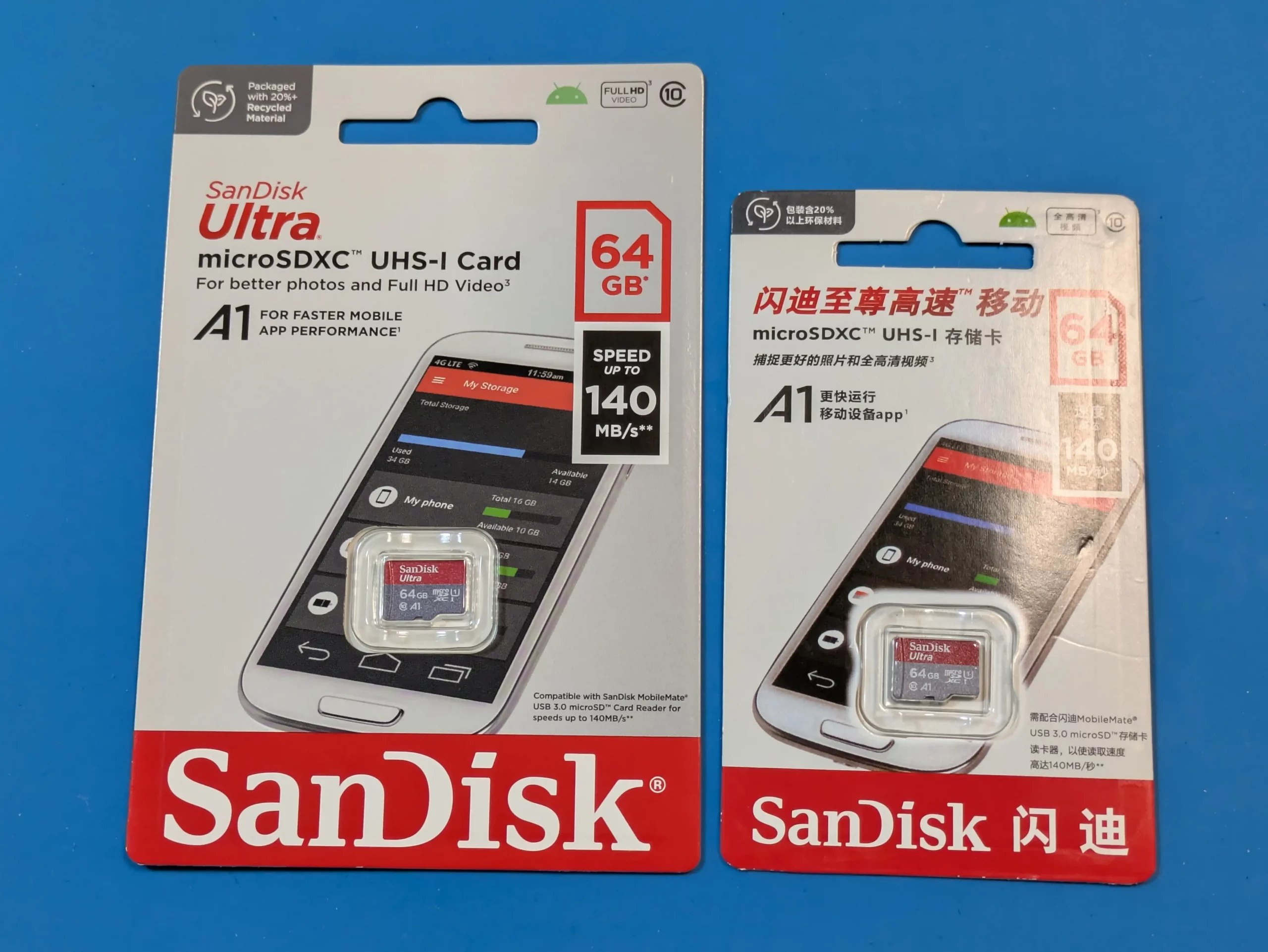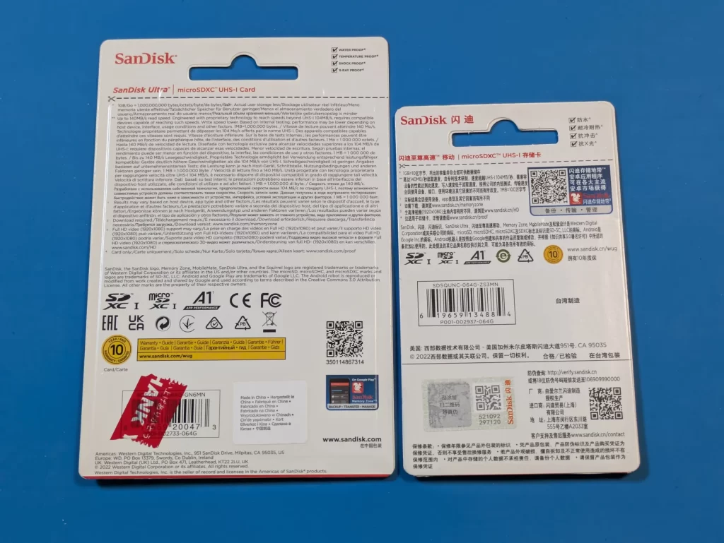 主なデザインは同じですが、パッケージサイズが異なります(同等のSanDisk Ultra製品ですが、型番が若干違います。その影響も有るかもしれません)。