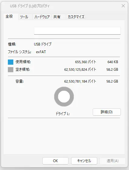 PCへSDカードの接続を行いました。Windows 上では64GBのSDカードとして認識しています。