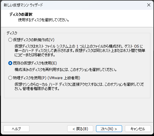 VMware Workstation で既存の仮想ディスクを指定し仮想マシンを新規作成する手順