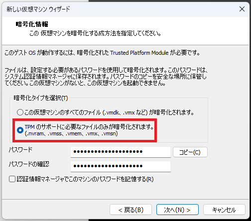 VMware Workstation やVMware Fusion にWindows 11 などのOSをインストールする際、TPM(Trusted Platform Module)の要件により仮想マシンに暗号化(パスワード)を設定する必要があります。