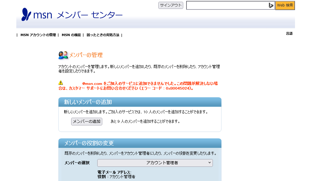 2025年9月現在、MSN メンバーセンターを利用して @msn.com のメールアドレスを新規取得しようとすると、エラーコード「0x80045024」が表示され、利用できません。