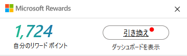 管理人はBing をメイン検索エンジンとして使用していない かつMicrosoft Rewards を意識していませんが、Microsoft アカウントを確認すると「1,724」リワードポイントが既に貯まった状態でした。