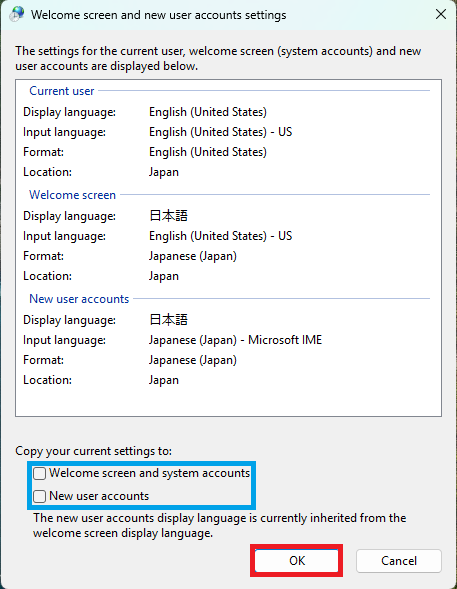 ③「ようこそ画面とシステム アカウント(Welcome screen and system account)」と「新しいユーザーアカウント(New user accounts)」にチェックを入れ、「OK」をクリックします。