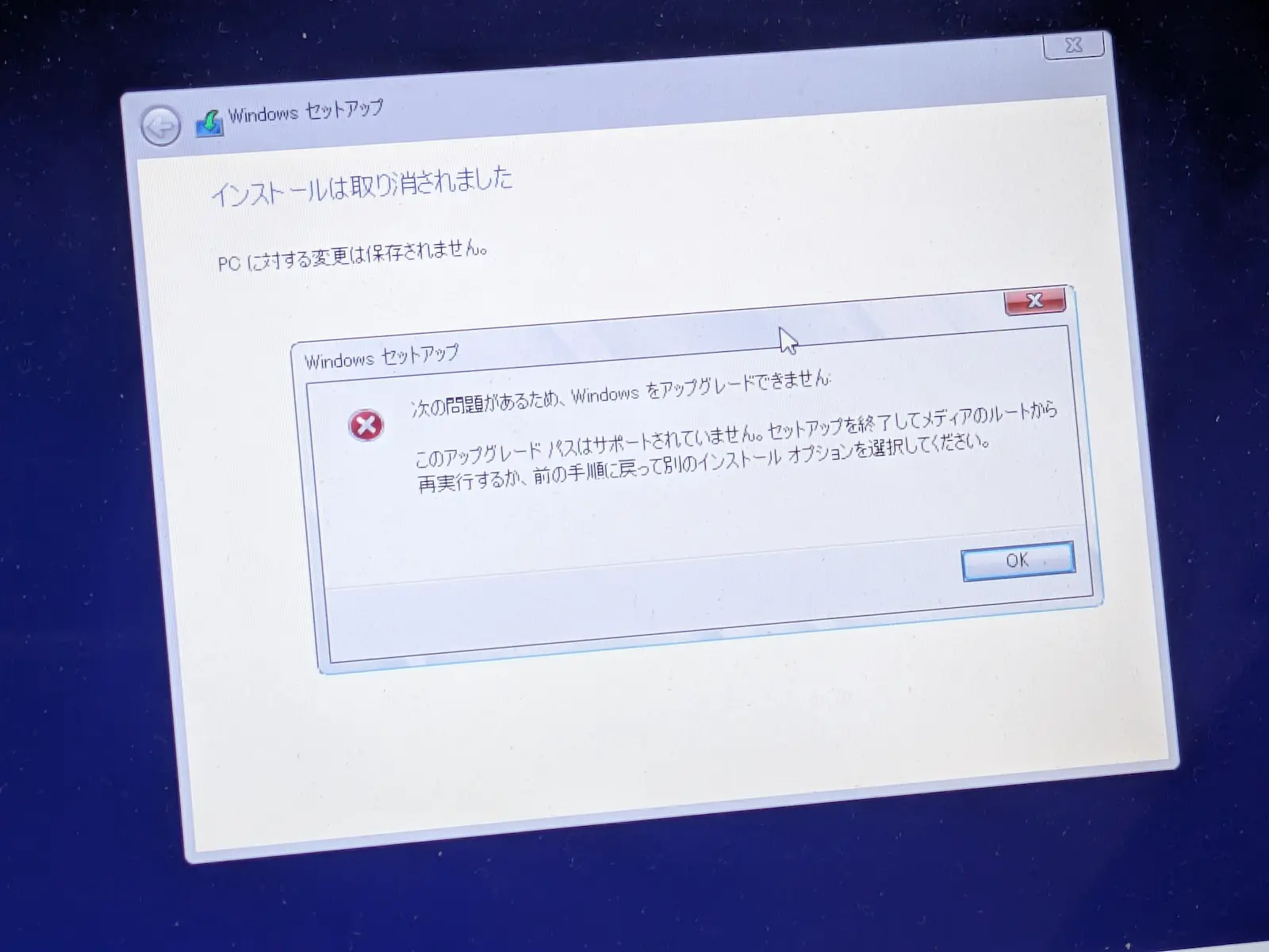このアップグレード パスはサポートされていません。セットアップを終了してメディアのルートから再実行するか、前の手段に戻って別のインストールオプションを選択してください。