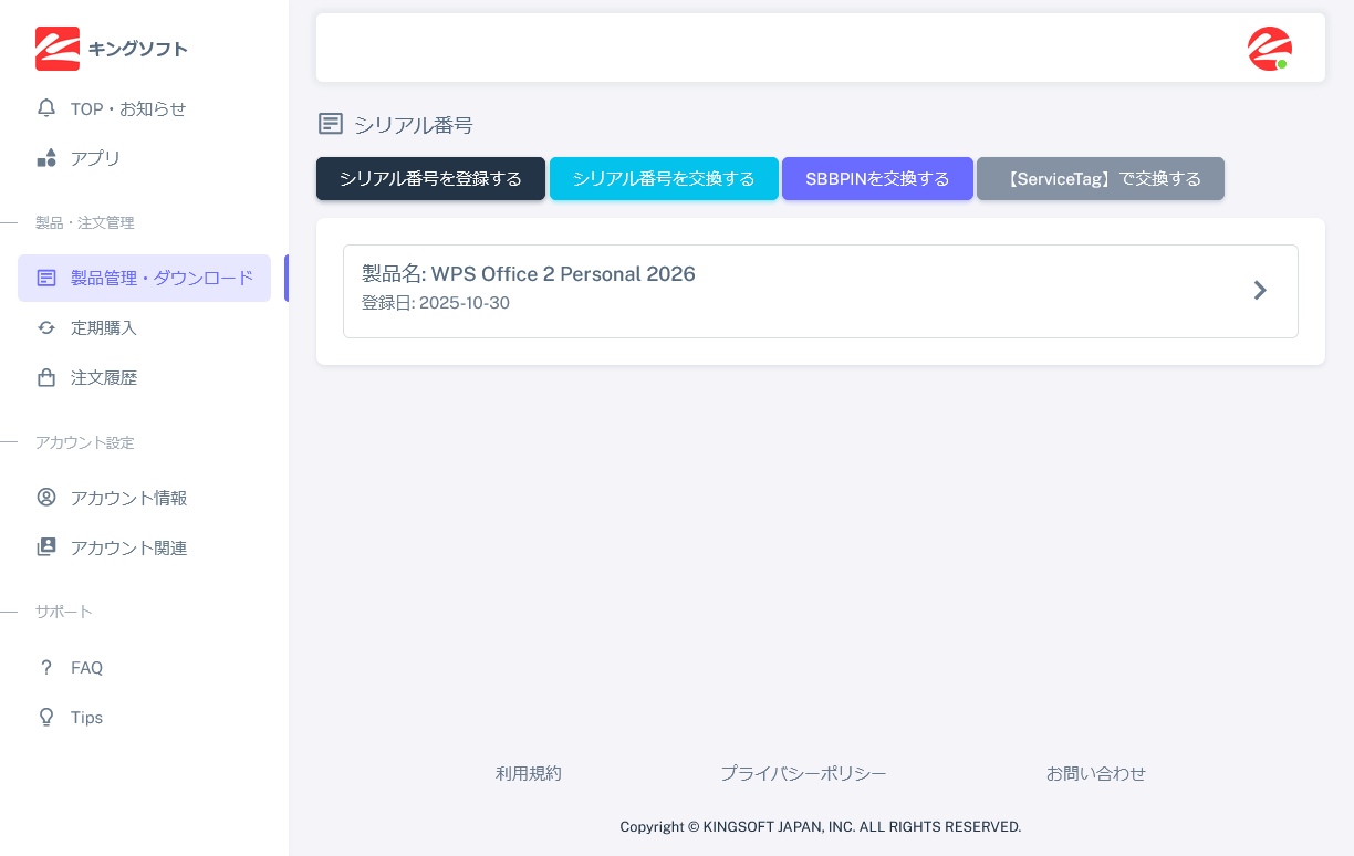 ①キングソフトユーザーセンターにログインし、左メニューの「製品管理・ダウンロード」から「シリアル番号を交換する」をクリックします。